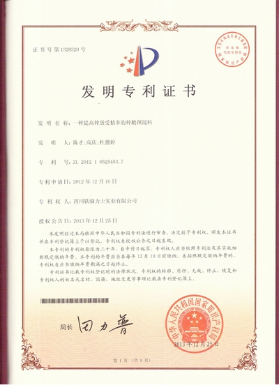 2月17日(ri),由鐵騎力(li)士集(ji)團(tuán)馮光德(dé)實驗(yàn)室申請(qing)的(de)《一(yi)種提高(gao)種蛋受精(jīng)率的(de)種鵝預混料》獲得國(guo)傢(jia)髮(fa)明專(zhuan)利授(shou)權,專(zhuan)利号爲(wei)ZL201210525453.7。